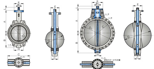 表中DN50(2")~500(20")中D1和n-Φ尺寸為蝶閥本身安裝定位尺寸,其中DN50(2")~350(14")的D1和n-Φ尺寸包容GB9112-99,DIN2501(德國), BS4504(英國),ISO2084、ISO2531(國際標(biāo)準(zhǔn)),BS10-E(英國),ANSI1259(美國)等法蘭連接標(biāo)準(zhǔn)。DN400(16")~500(20")包容GB9112-88、DIN2501、ISO2084、BS4504法蘭連接標(biāo)準(zhǔn)。